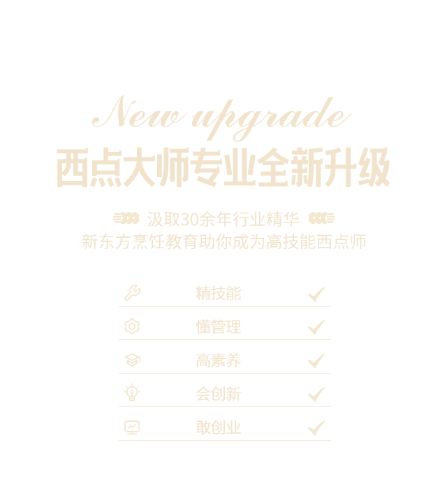 胜任各类酒店、大型西点企业店长、技术总监并具备运营管理能力